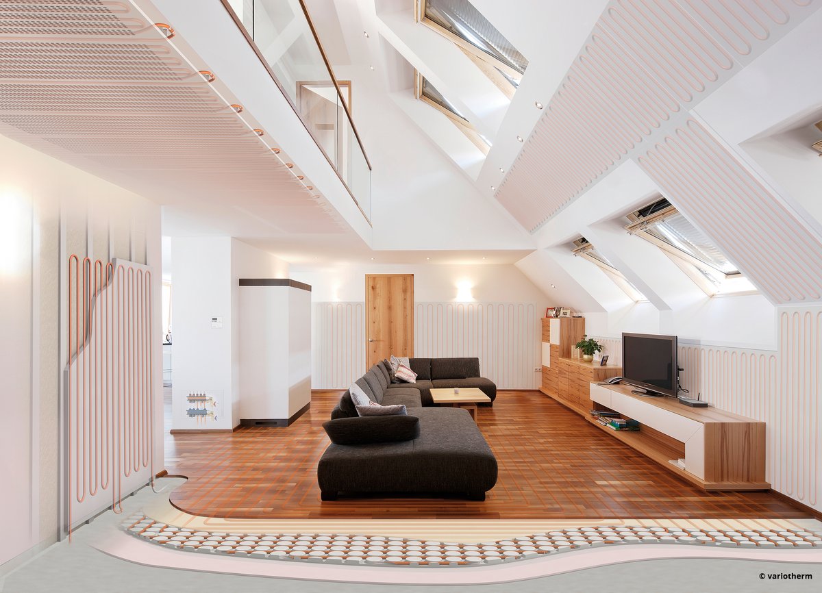 The VARIOTHERM system is a water based cooling system that can be installed in your floor (below tiles or other surfaces), as a suspended ceiling and as walls. Cold water is circulating through the specially developed multi composite pipes and cools the surroundings. Thus a cool clima is equally archived in every room. The system is completely silent, not visible and does not create areas of discomfort as AC units do. Thus it creates not only a cooling effect, but also enhances the comfort by reducing the noice related stress level. It will improve the quality of your daily life as well as your sleep.