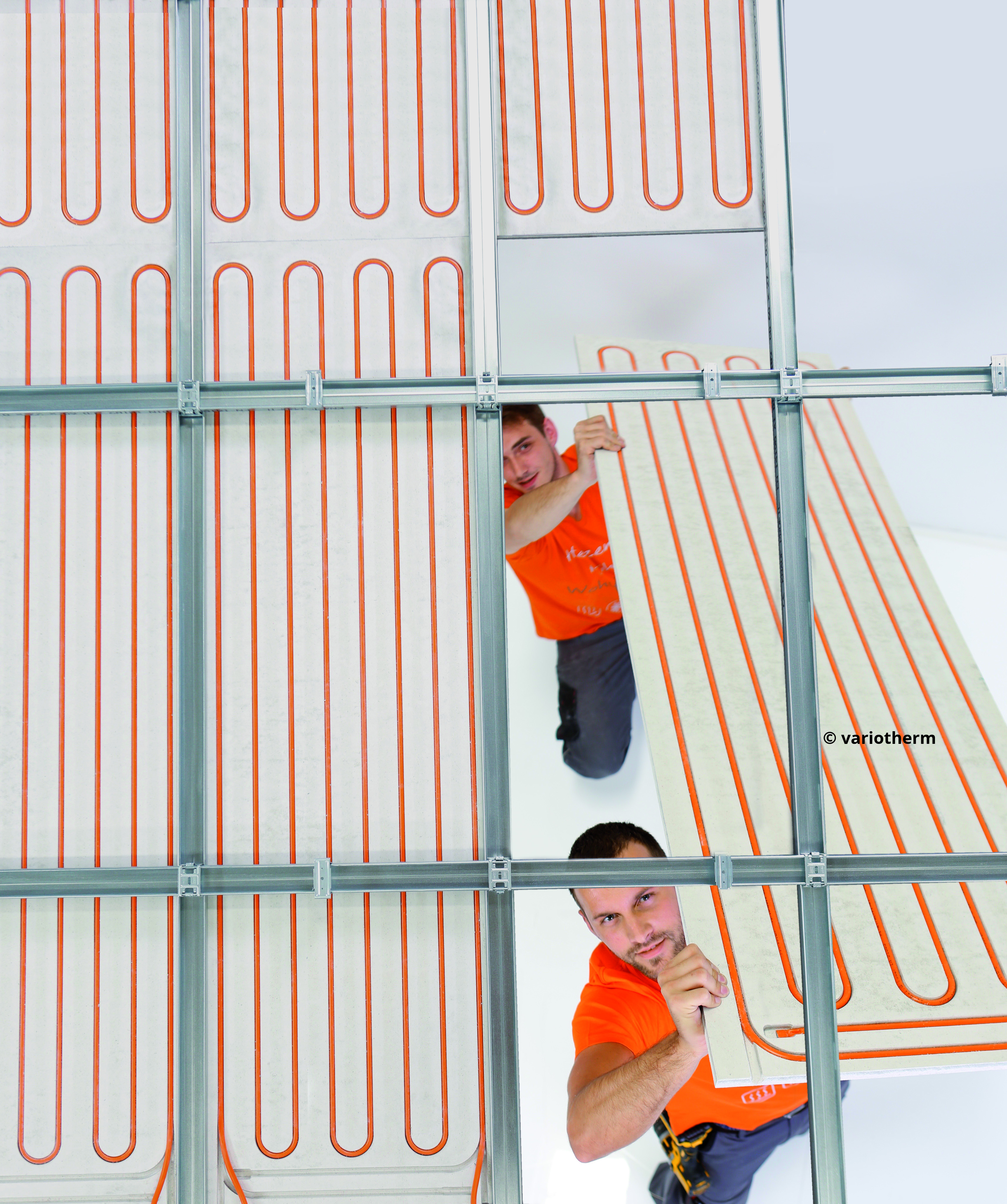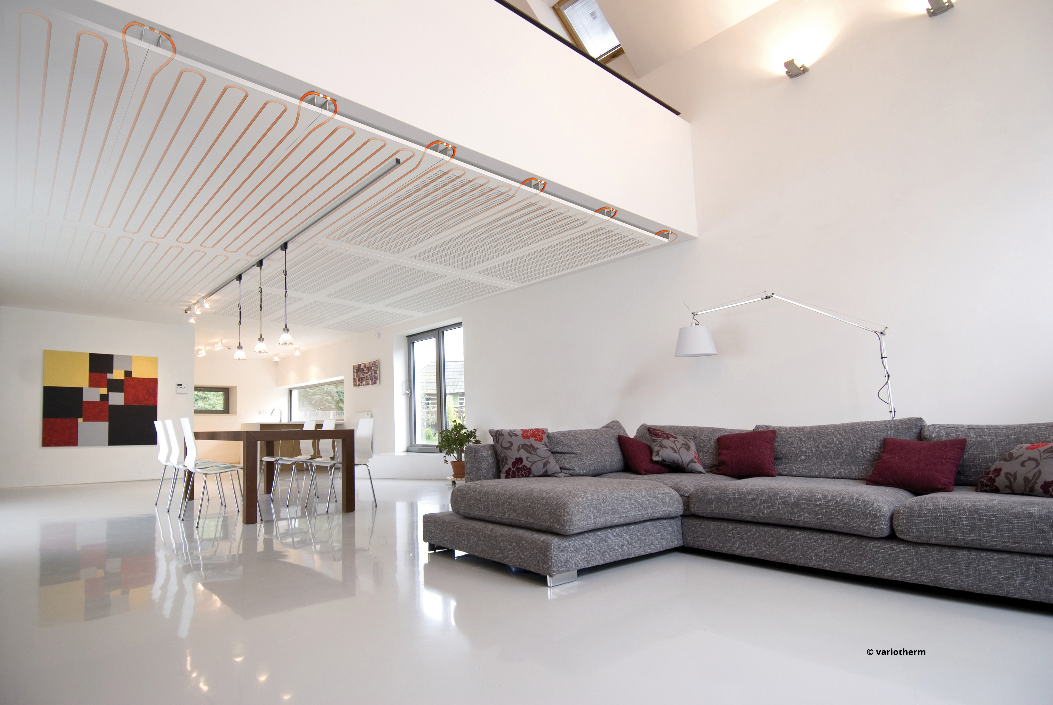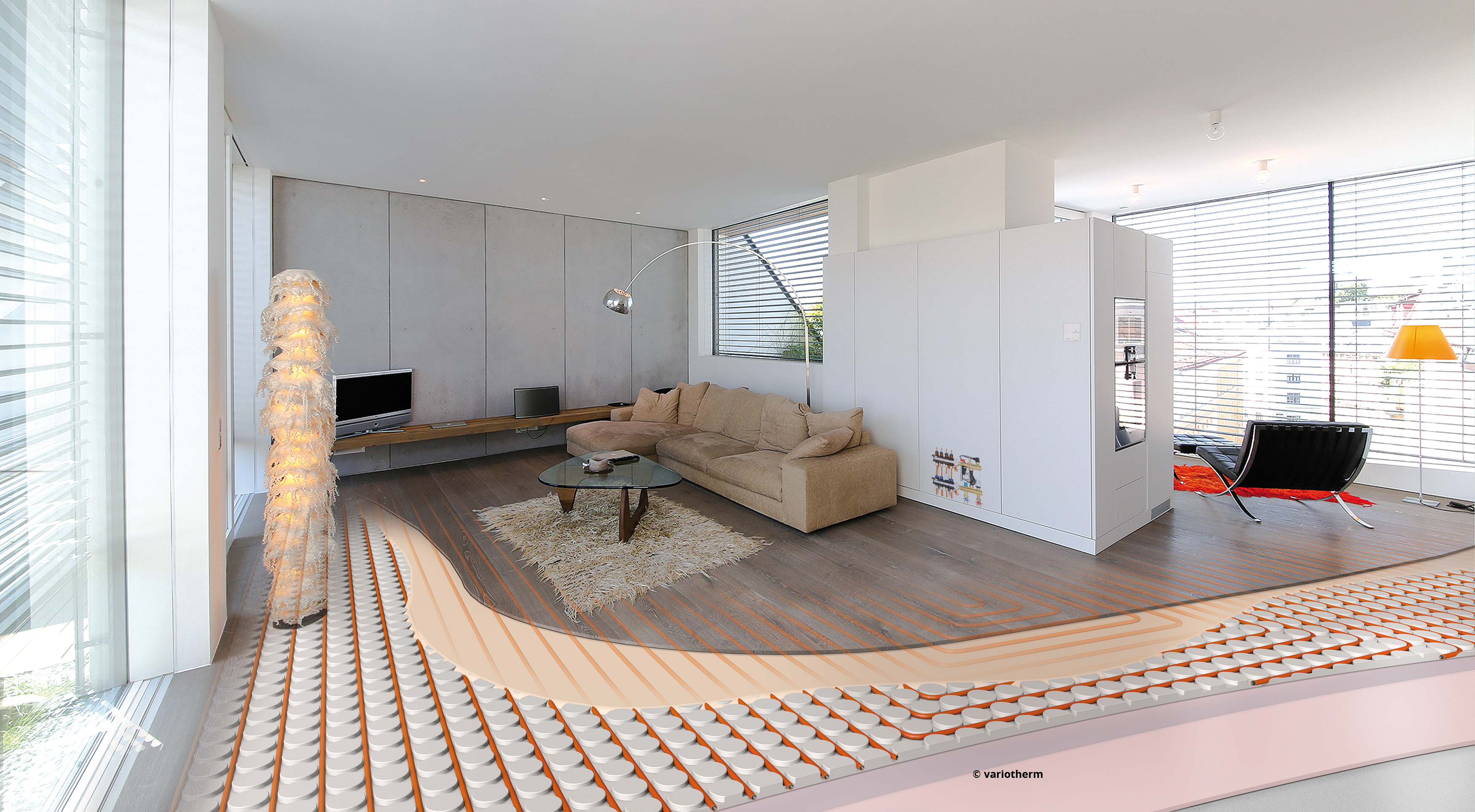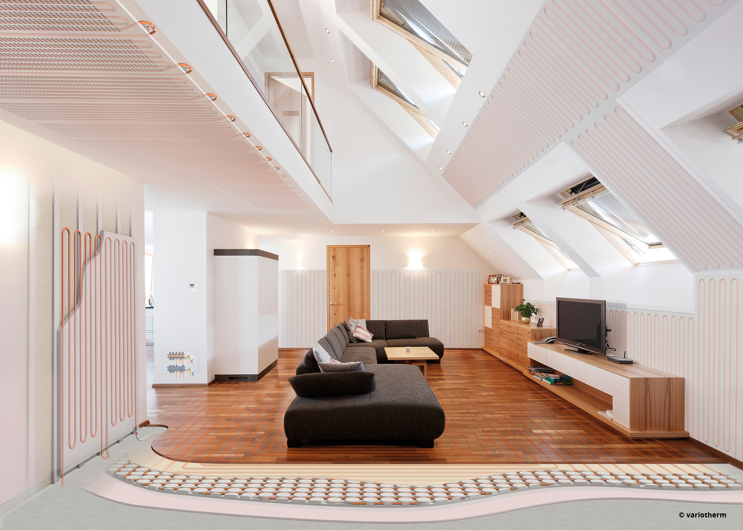 The VARIOTHERM system is a water based cooling system that can be installed in your floor (below tiles or other surfaces), as a suspended ceiling and as walls. Cold water is circulating through the specially developed multi composite pipes and cools the surroundings. Thus a cool clima is equally archived in every room. The system is completely silent, not visible and does not create areas of discomfort as AC units do. Thus it creates not only a cooling effect, but also enhances the comfort by reducing the noice related stress level. It will improve the quality of your daily life as well as your sleep.